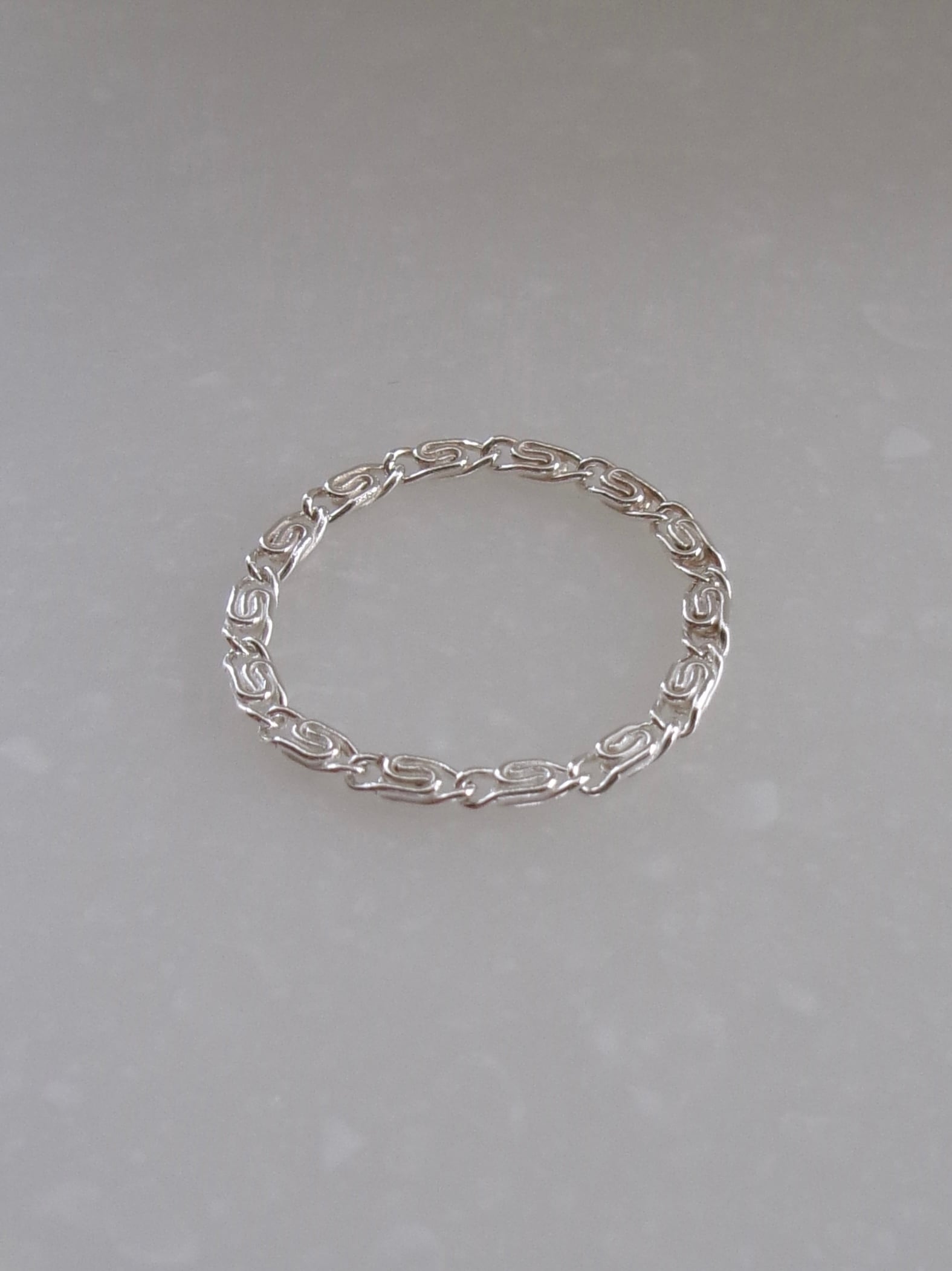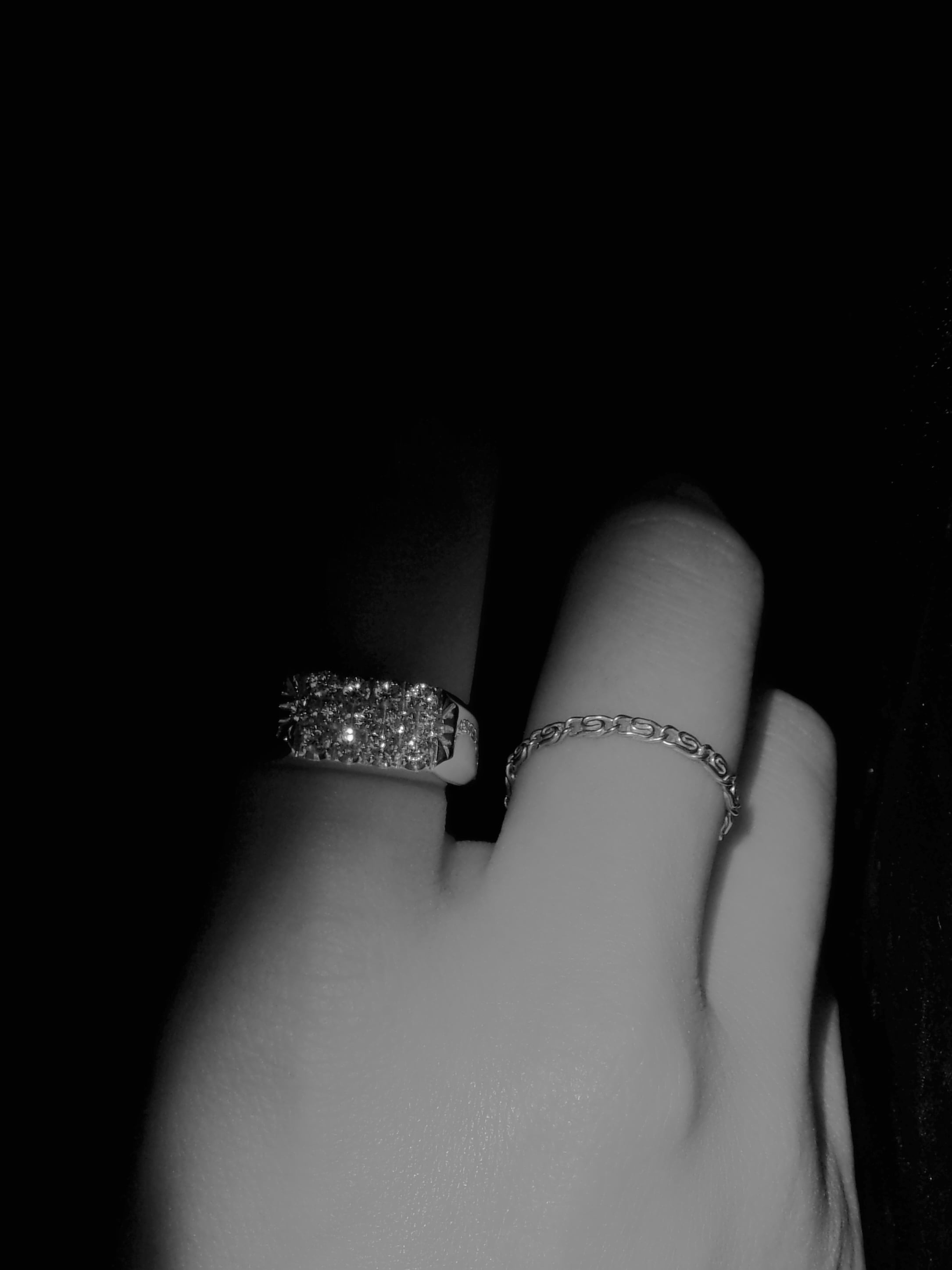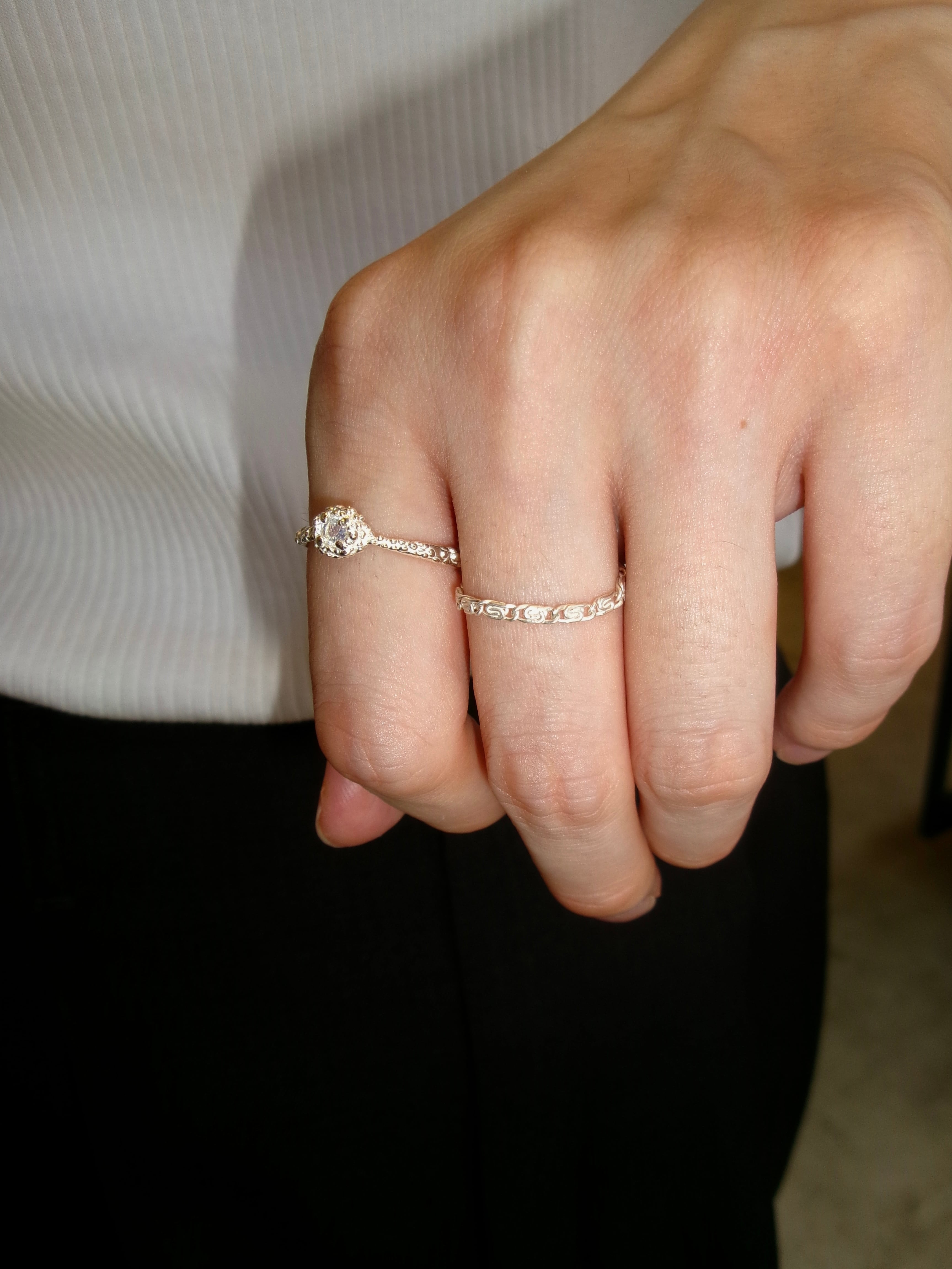他のリングとの重ね付けや、さりげなくピンキーリングとして使用するのもおすすめです。