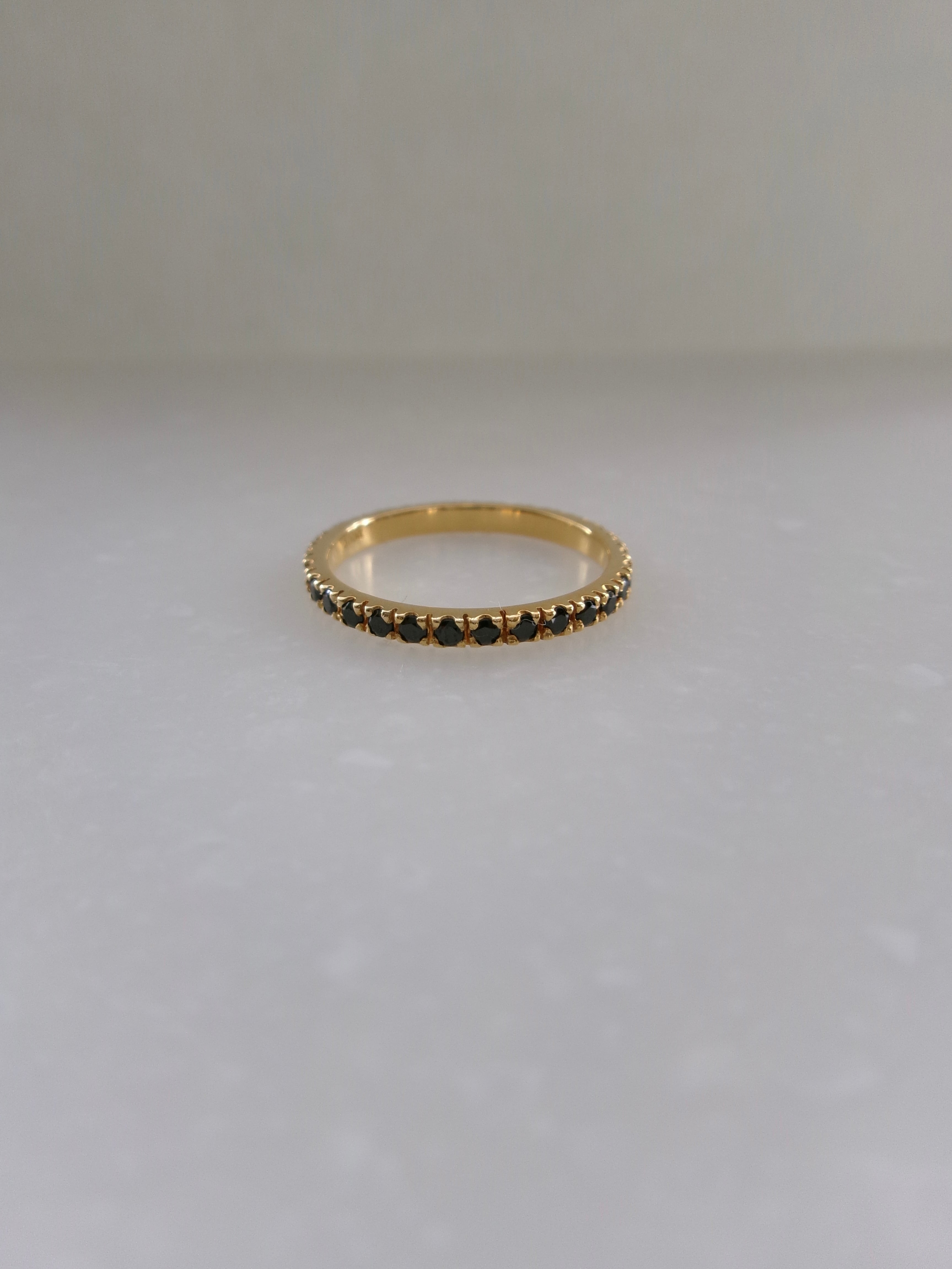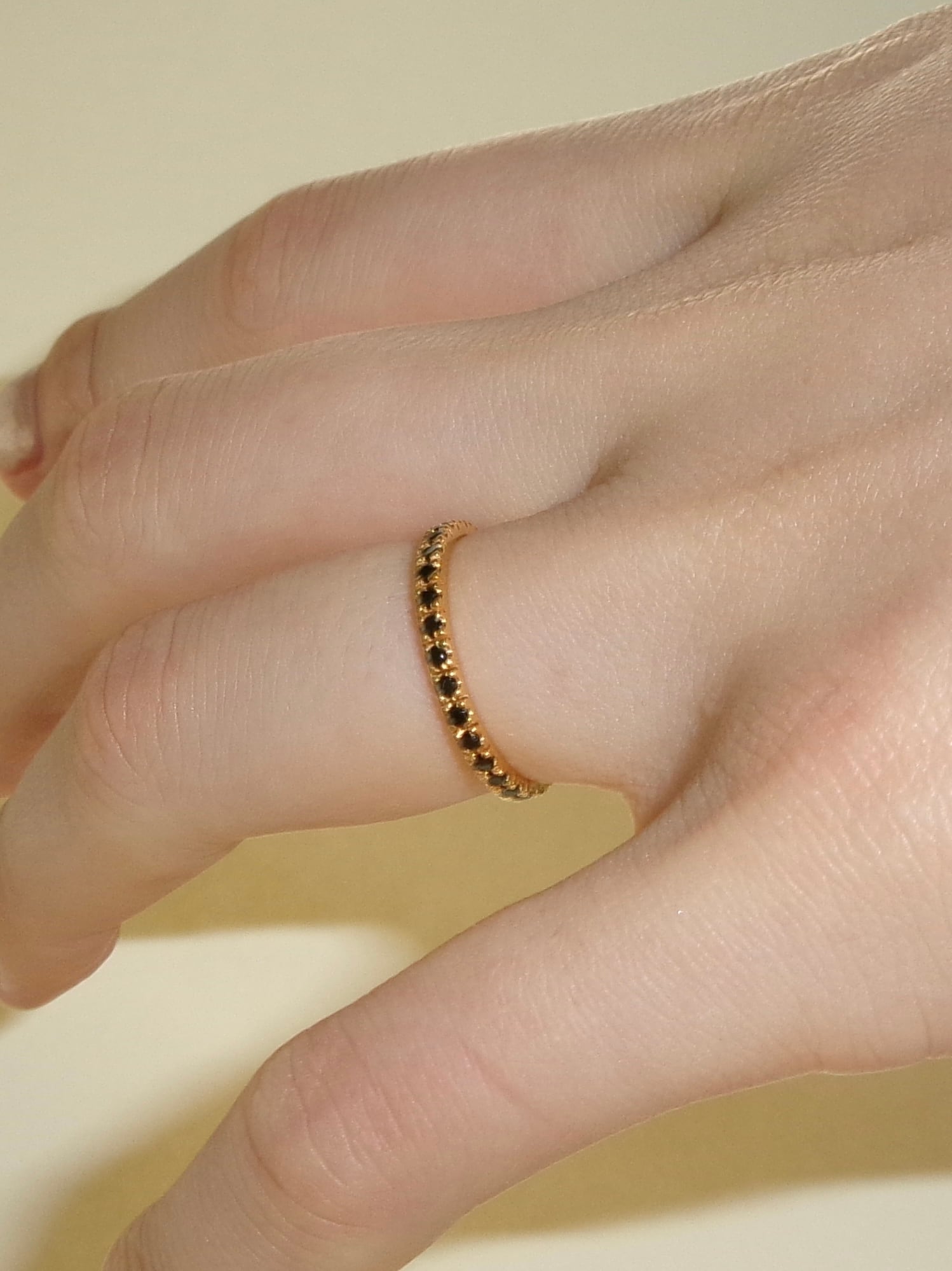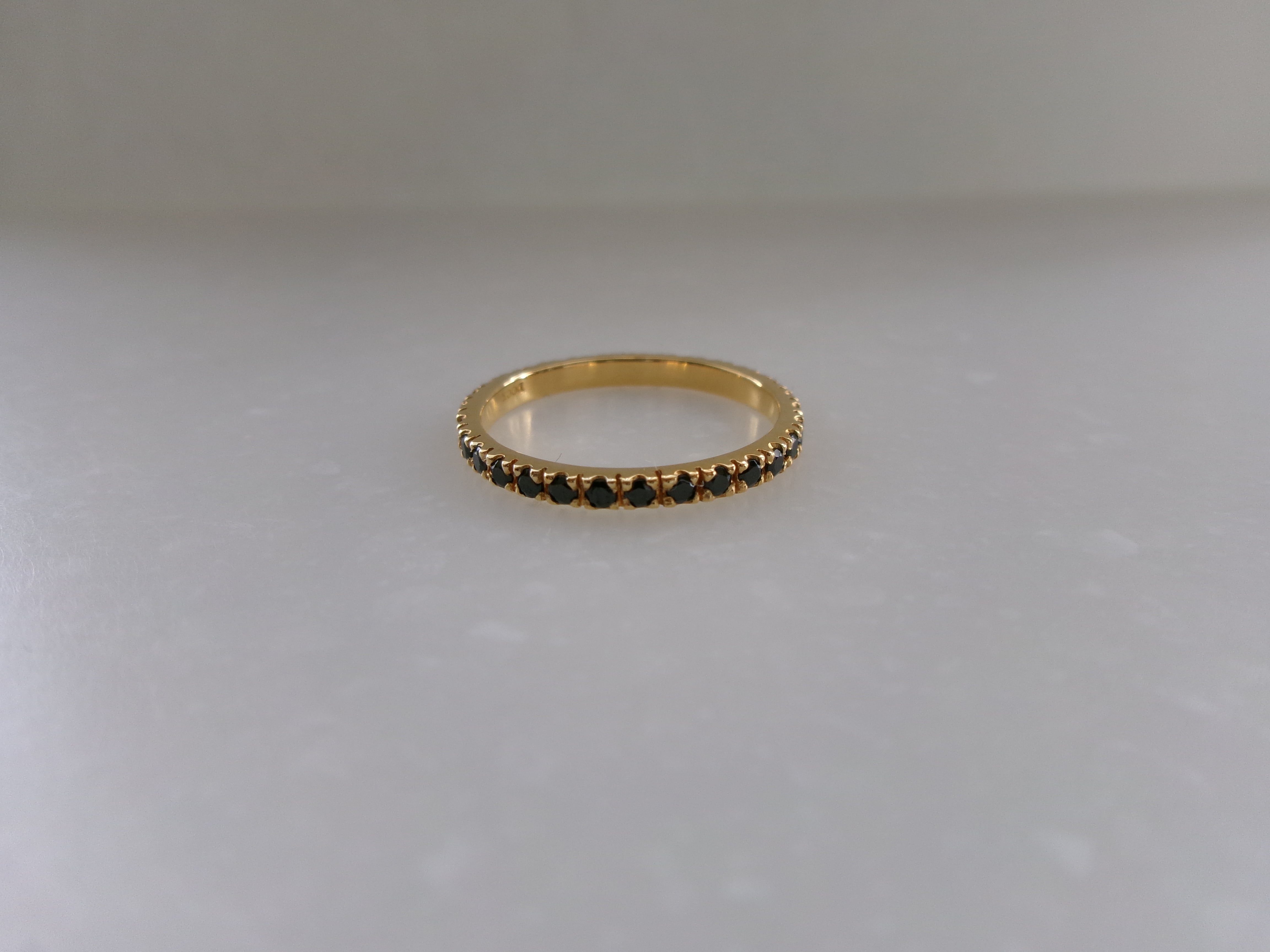 幅の細さにこだわったフルエタニティーリング。シンプルでありながらも、ジルコニアの輝きが手元で際立ち、普段のコーディネートのポイントに。